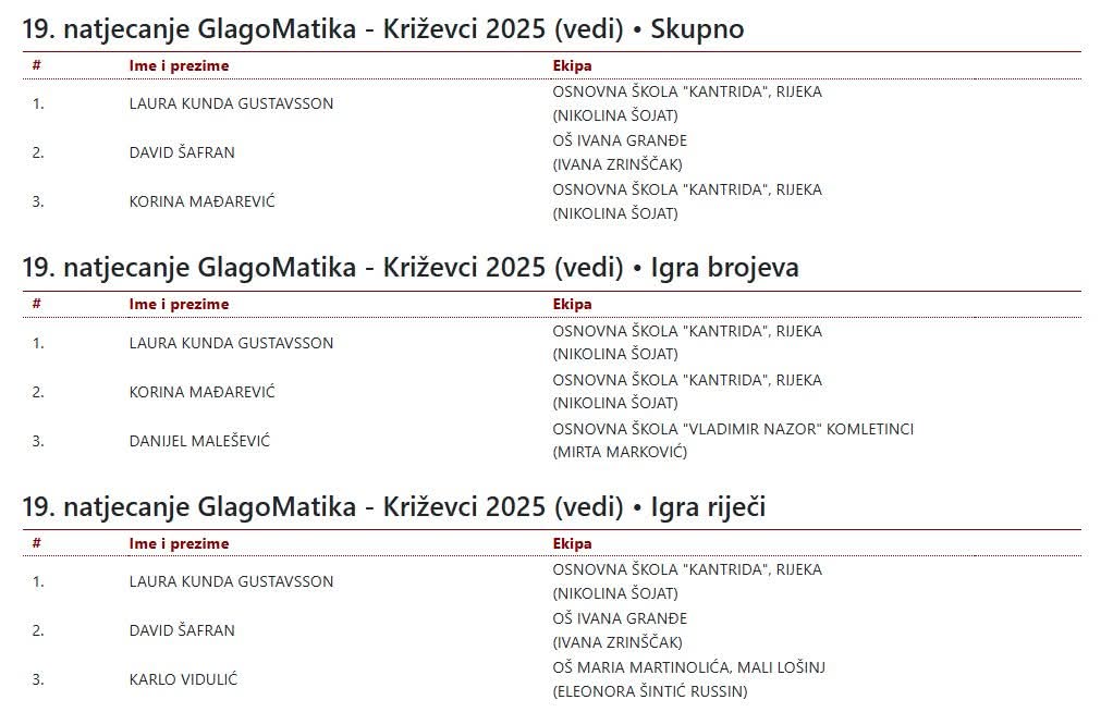 Pogled na ovojena mjesta sve nas je učinio ponosima jer su glagoljaši s Kantride vodeći u državi u obje igre i skupnim igrama. Tako je naša Laura Kunda Gustavsson zauzela prvo mjesto u Igri riječi, prvo mjesto u Igri brojeva i prvo mjesto u skupnim igrama. Naša Korina Mađarević zauzela je drugo mjesto u Igri brojeva i treće mjesto u Skupnim igrama. Natjecatelje očekuju još dva pripremna natjecanja nakon kojih će deset najboljih biti pozvano na završno natjecanje.
